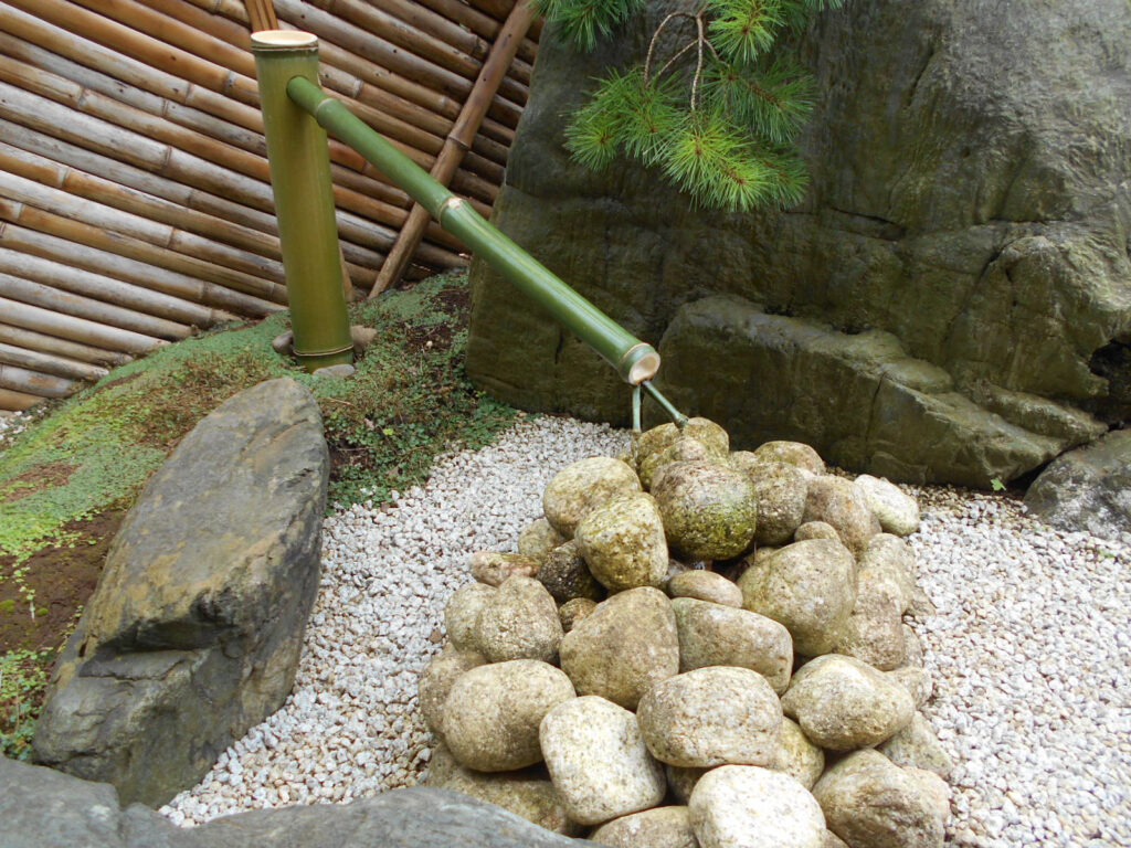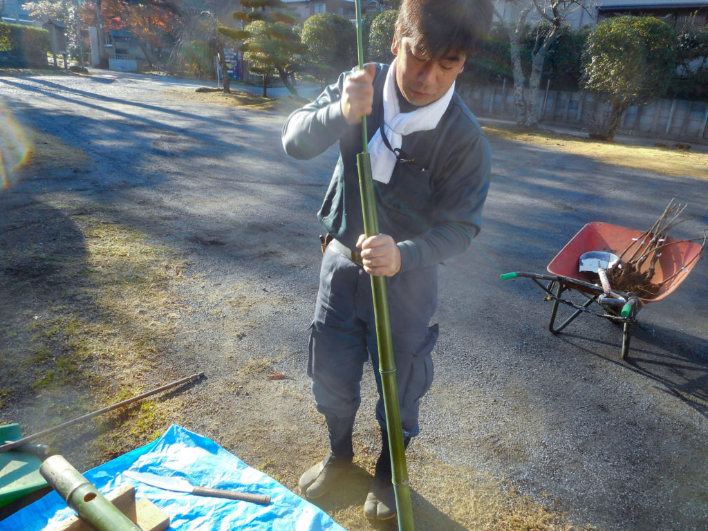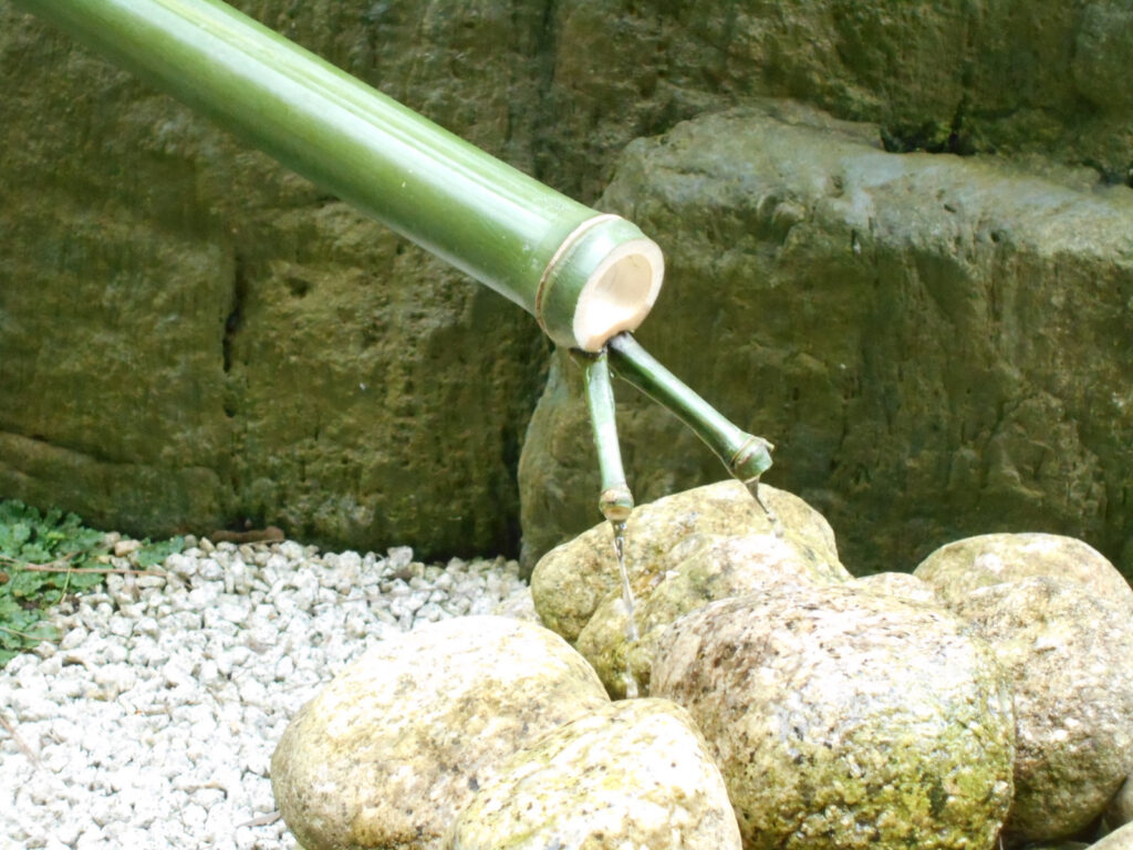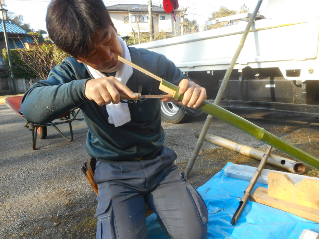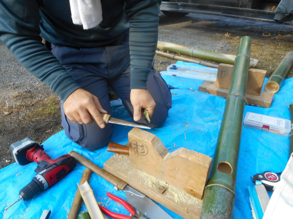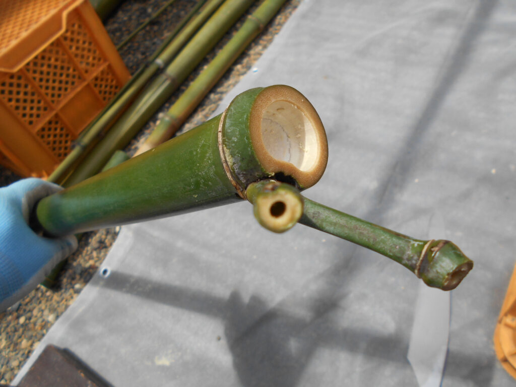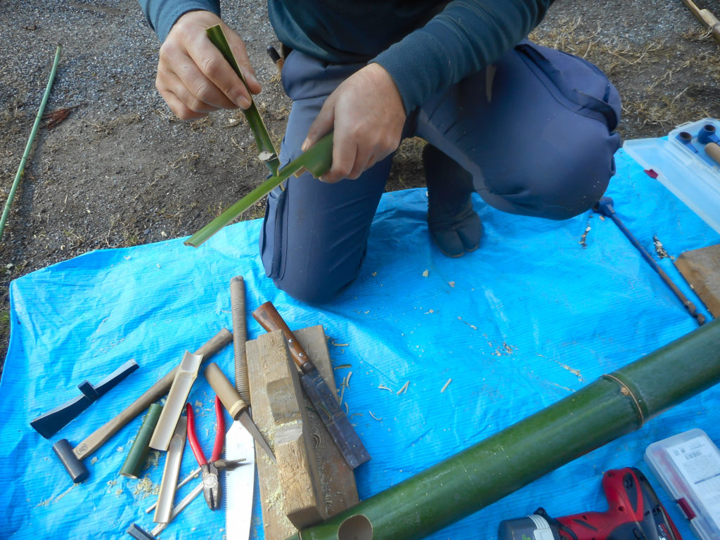 筧は一般に、手水鉢(ちょうずばち)に水を注ぎ込む装置です。駒頭(こまがしら)を付けるタイプなど様々ですが、ここでは横樋(よことい)の削ぎ落とし方を紹介します。失敗した時のために、中の節抜きと竹洗いは後回しにするのがコツです。竹細工の練習にはとても役立ちますので、皆様も試してみてください。