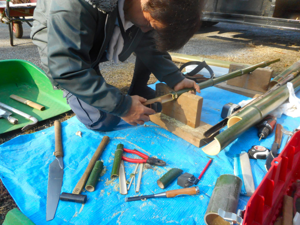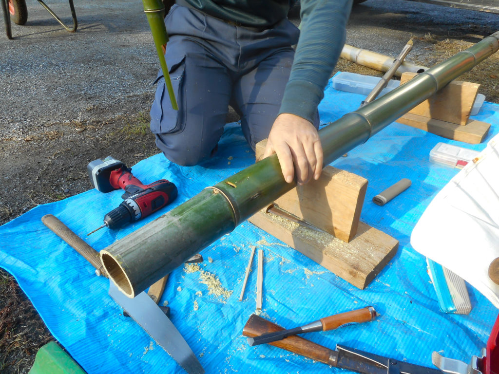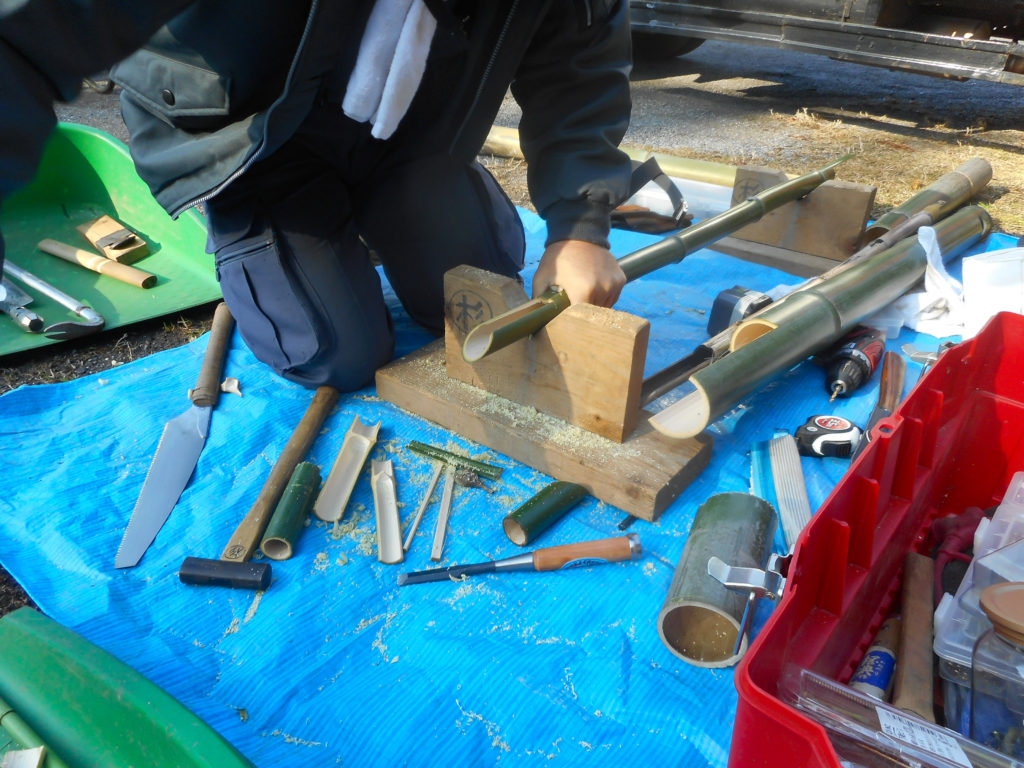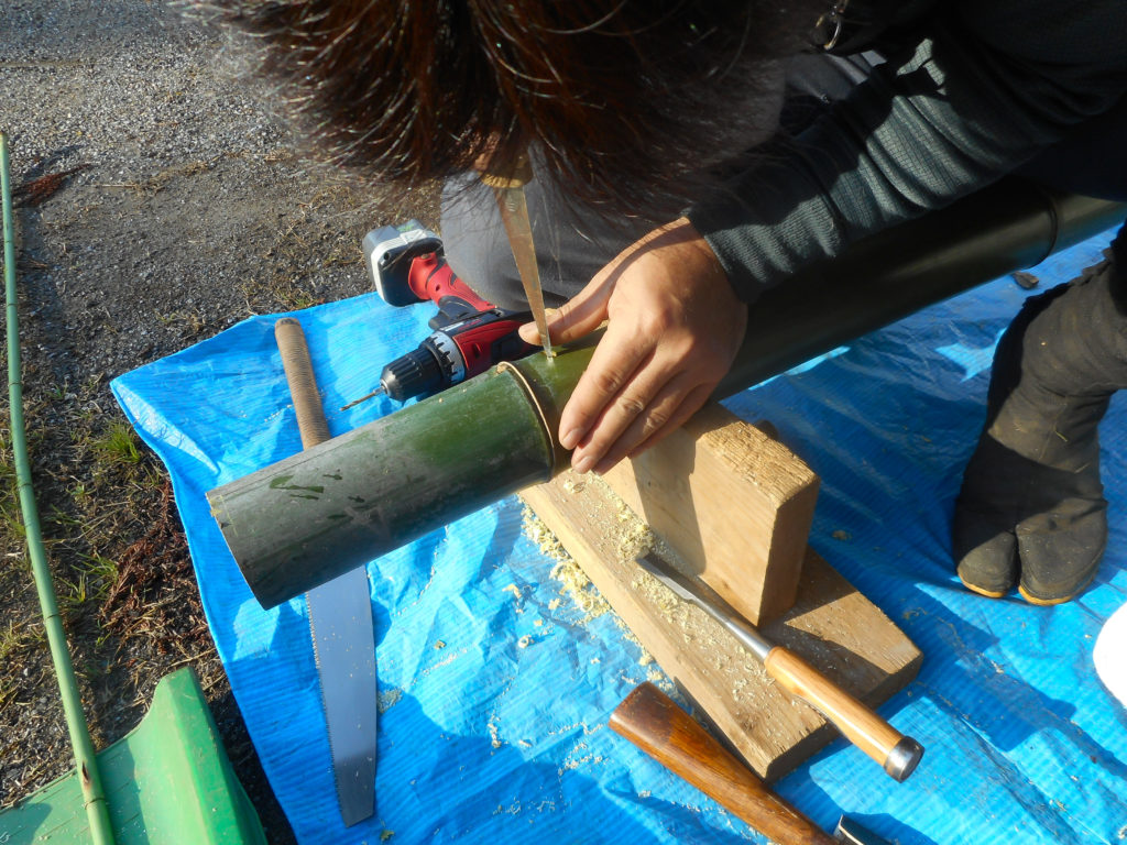 穴を切り出しナイフで微調整します。竹の削り方には、コツがあります。