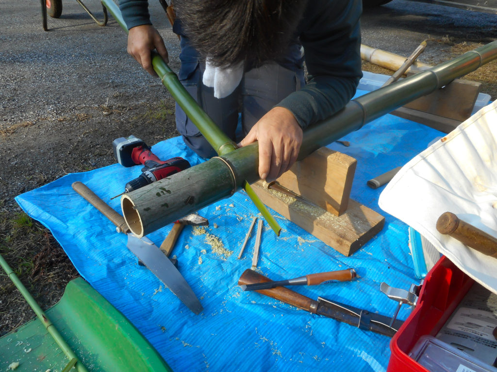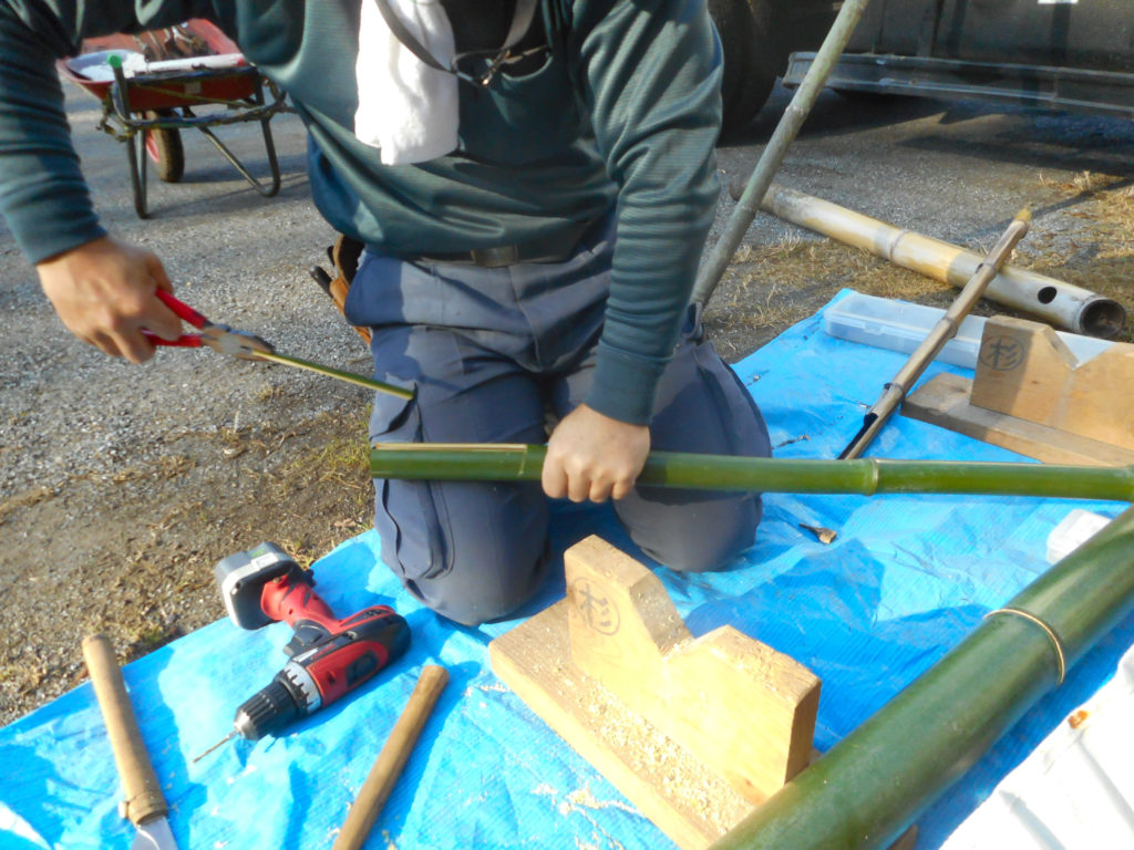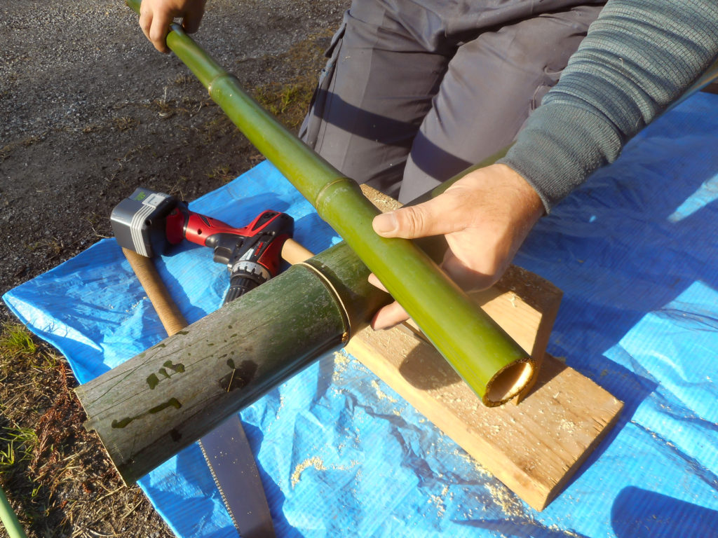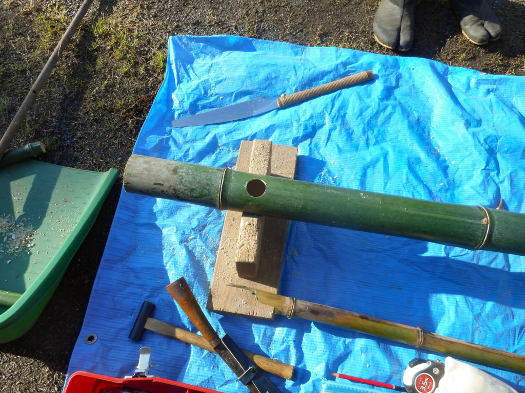 縦樋に横樋を当て赤鉛筆で印をした後、太竹にホルソーまたはドリルで穴を開けます。穴はノミや切り出しナイフだけでも開けることができます。