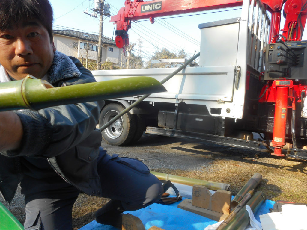 ここで細竹の横樋のモトを半分切り、加工しておきます。