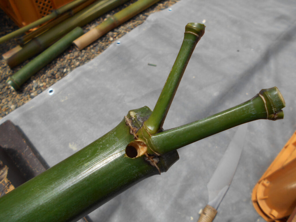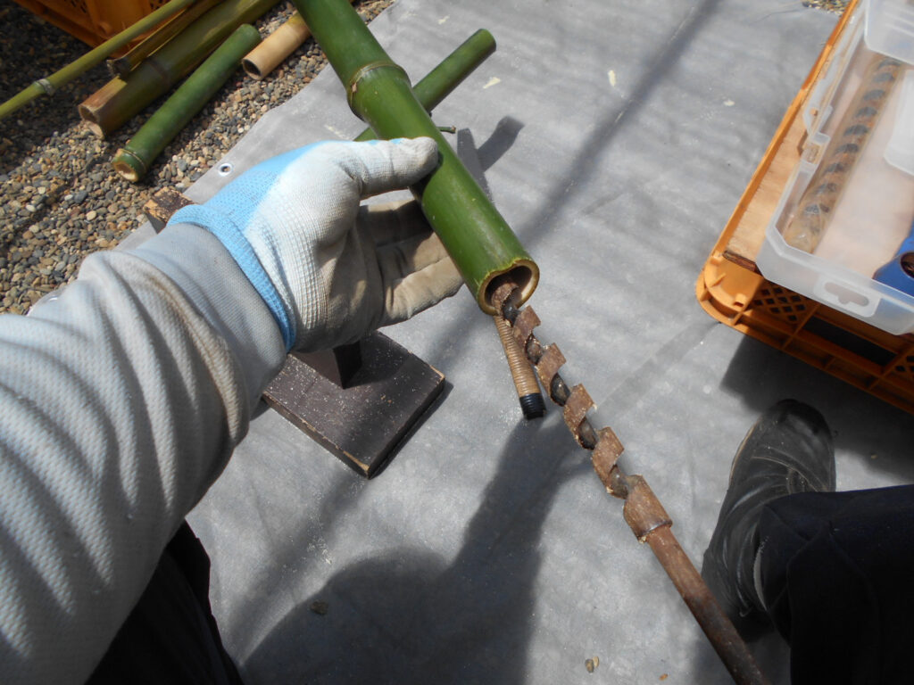 太竹の縦樋の裏が抜けました。次に細竹の横樋を差し込みます。
