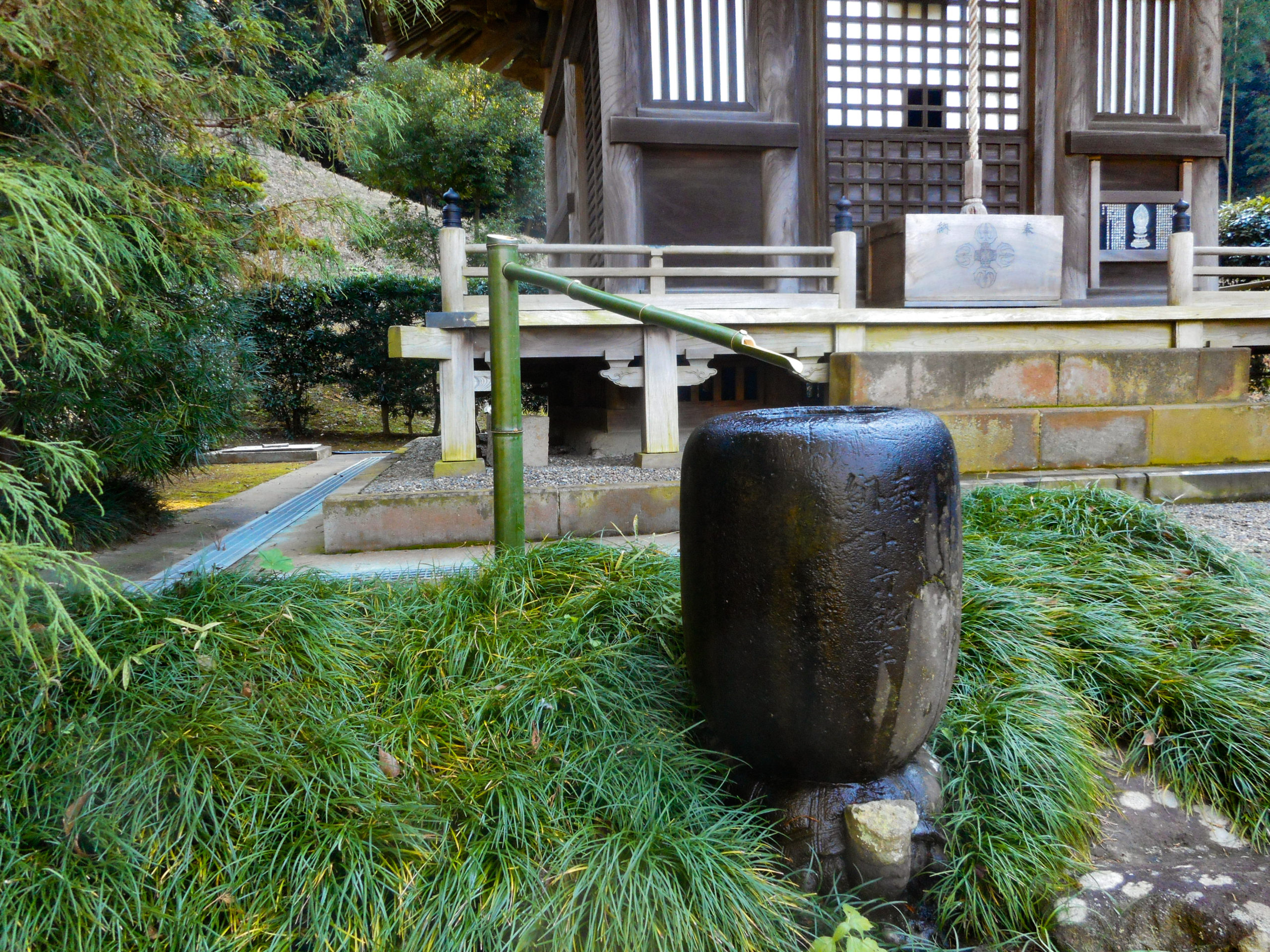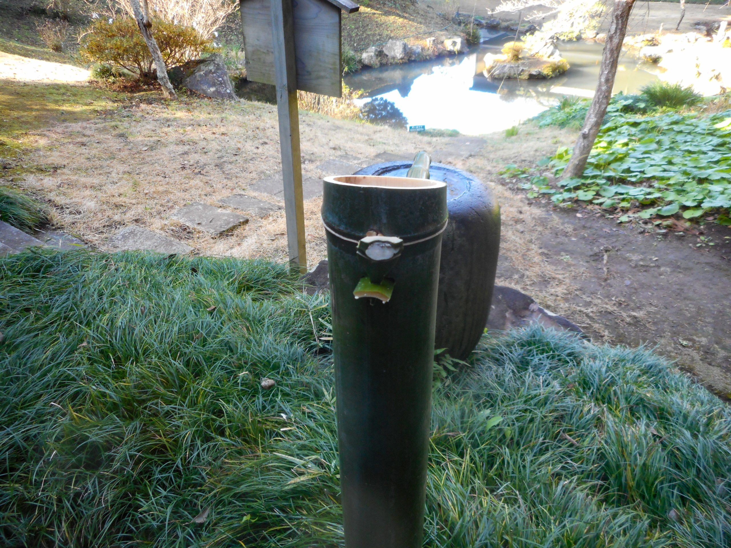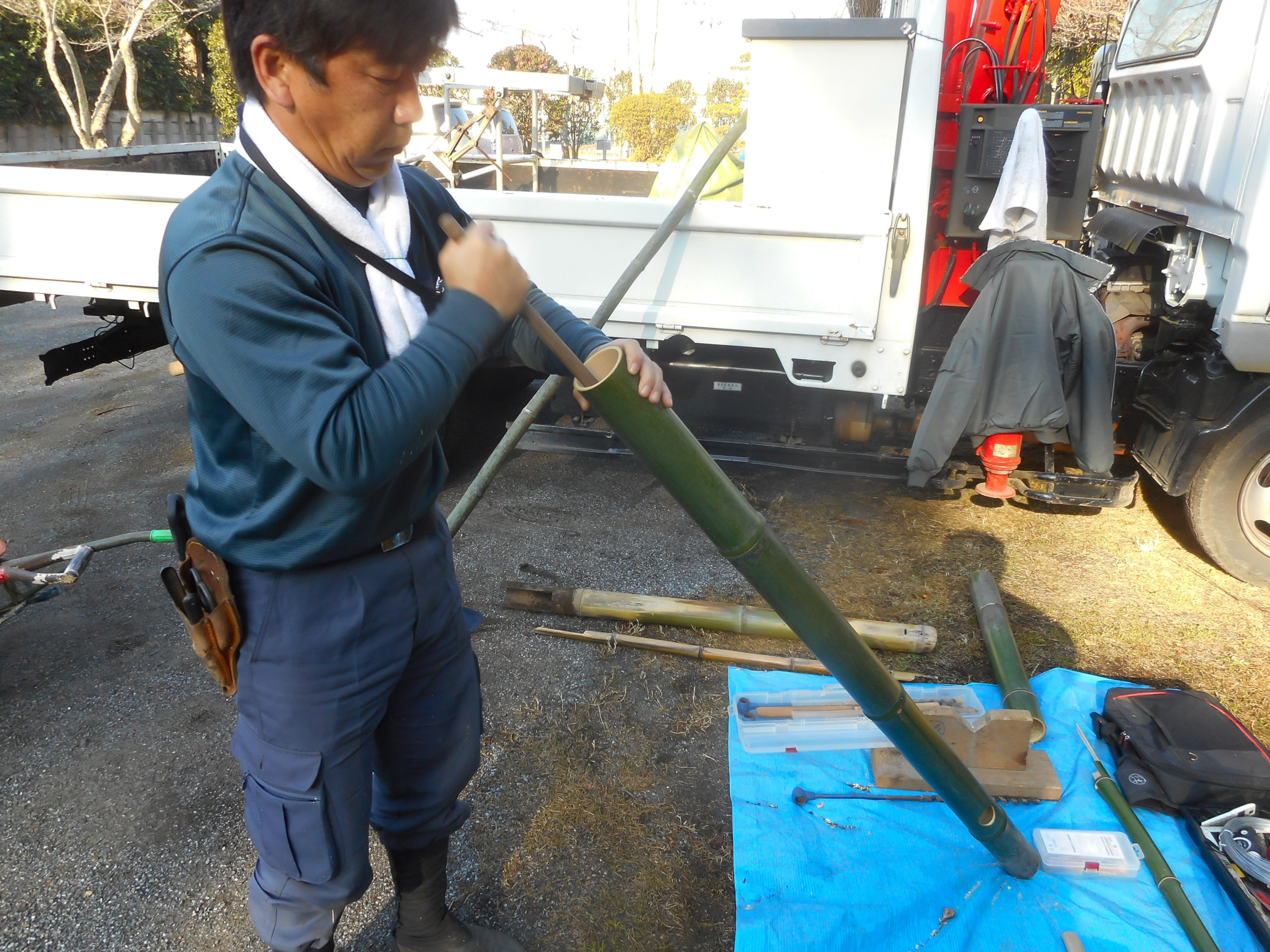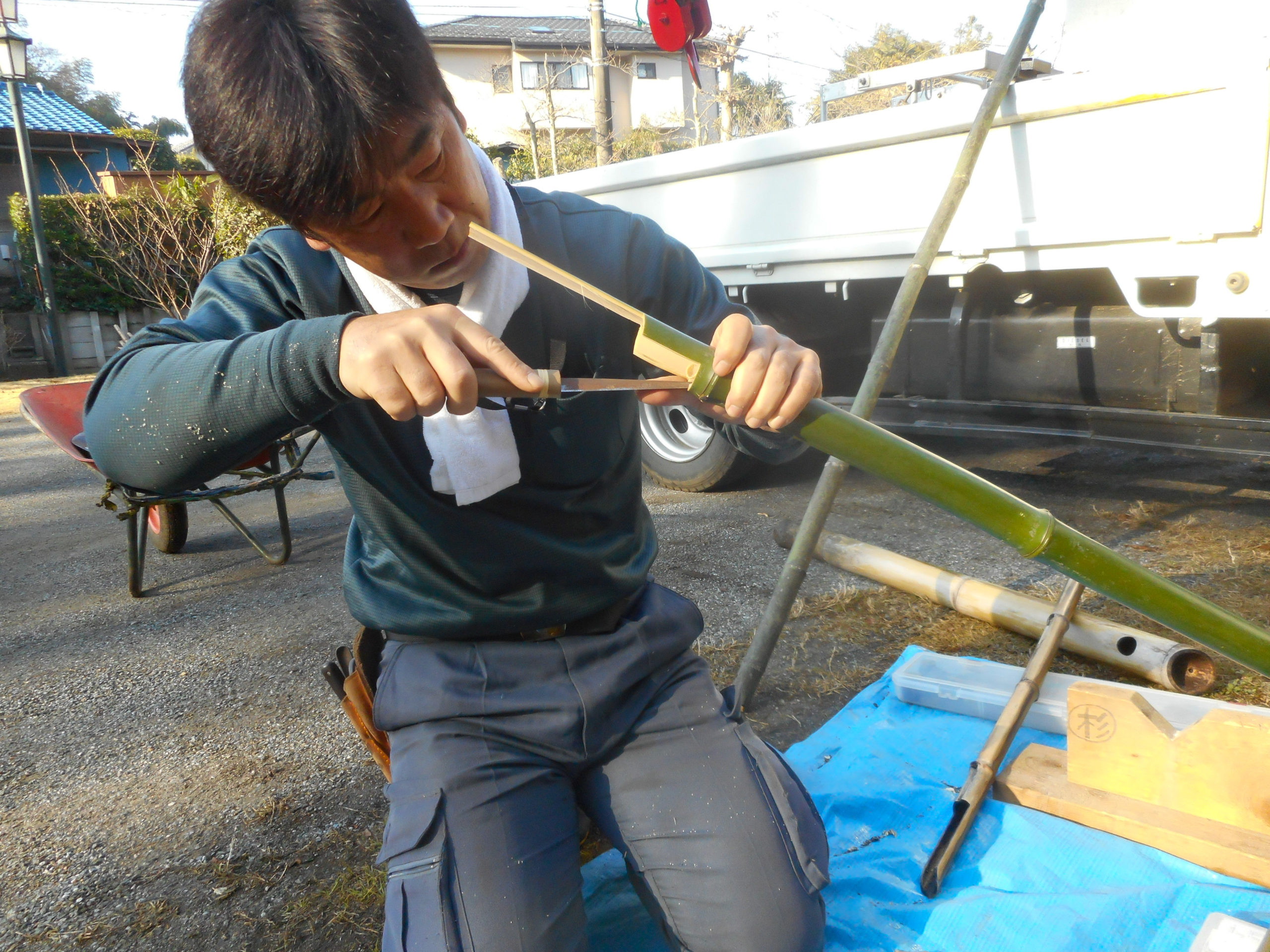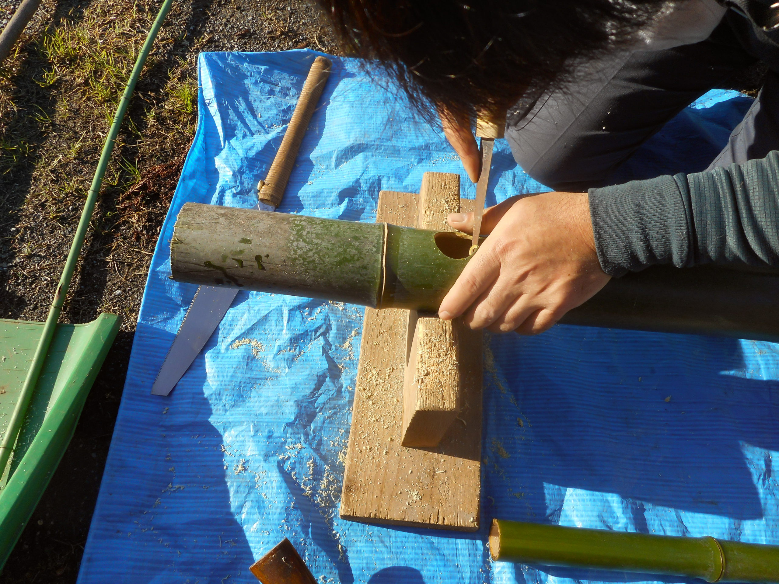筧は一般に、手水鉢(ちょうずばち)に水を注ぎ込む装置です。駒頭(こまがしら)を付けるタイプなど様々ですが、ここでは横樋(よことい)の削ぎ落とし方を紹介します。失敗した時のために、中の節抜きと竹洗いは後回しにするのがコツです。竹細工の練習にはとても役立ちますので、皆様も試してみてください。