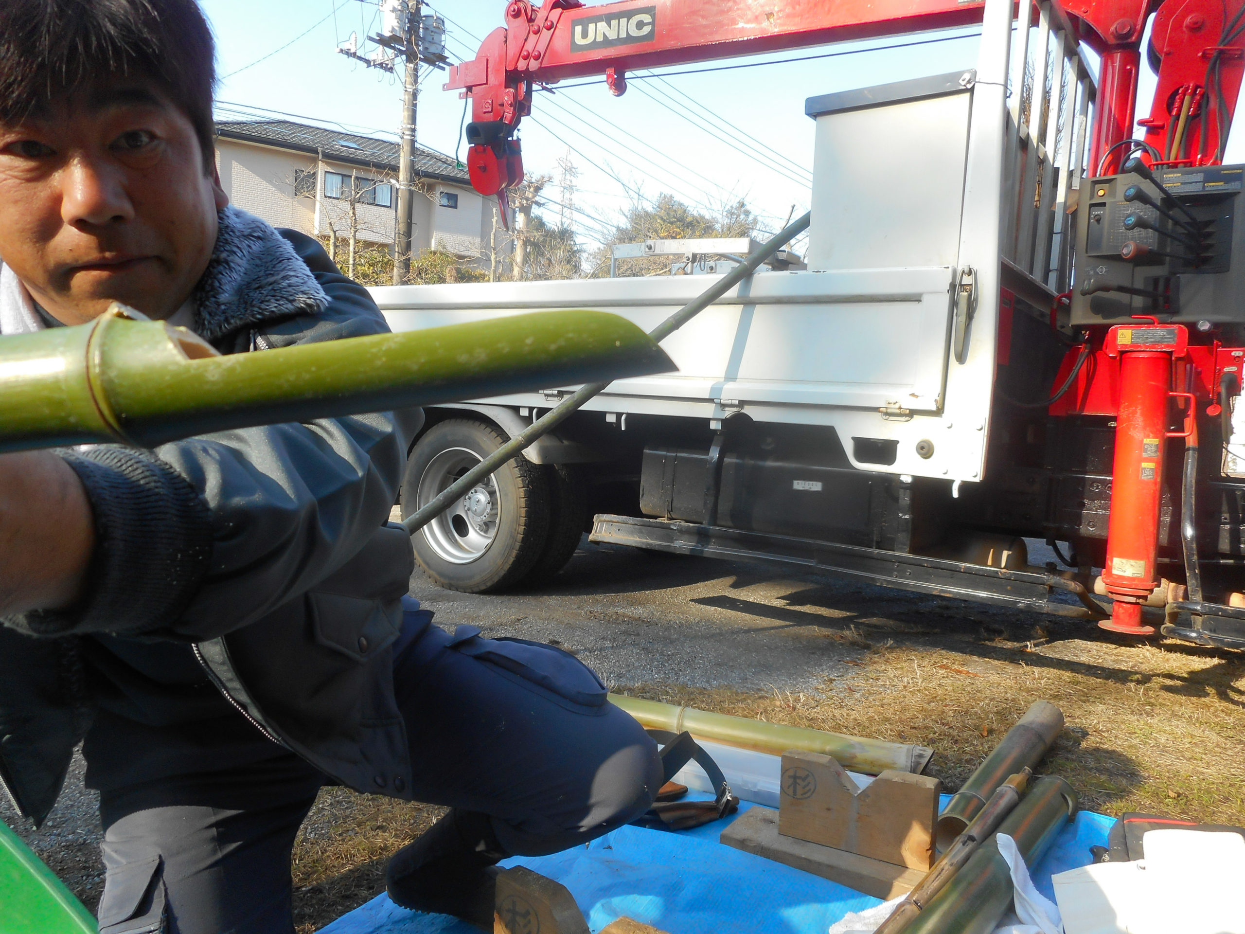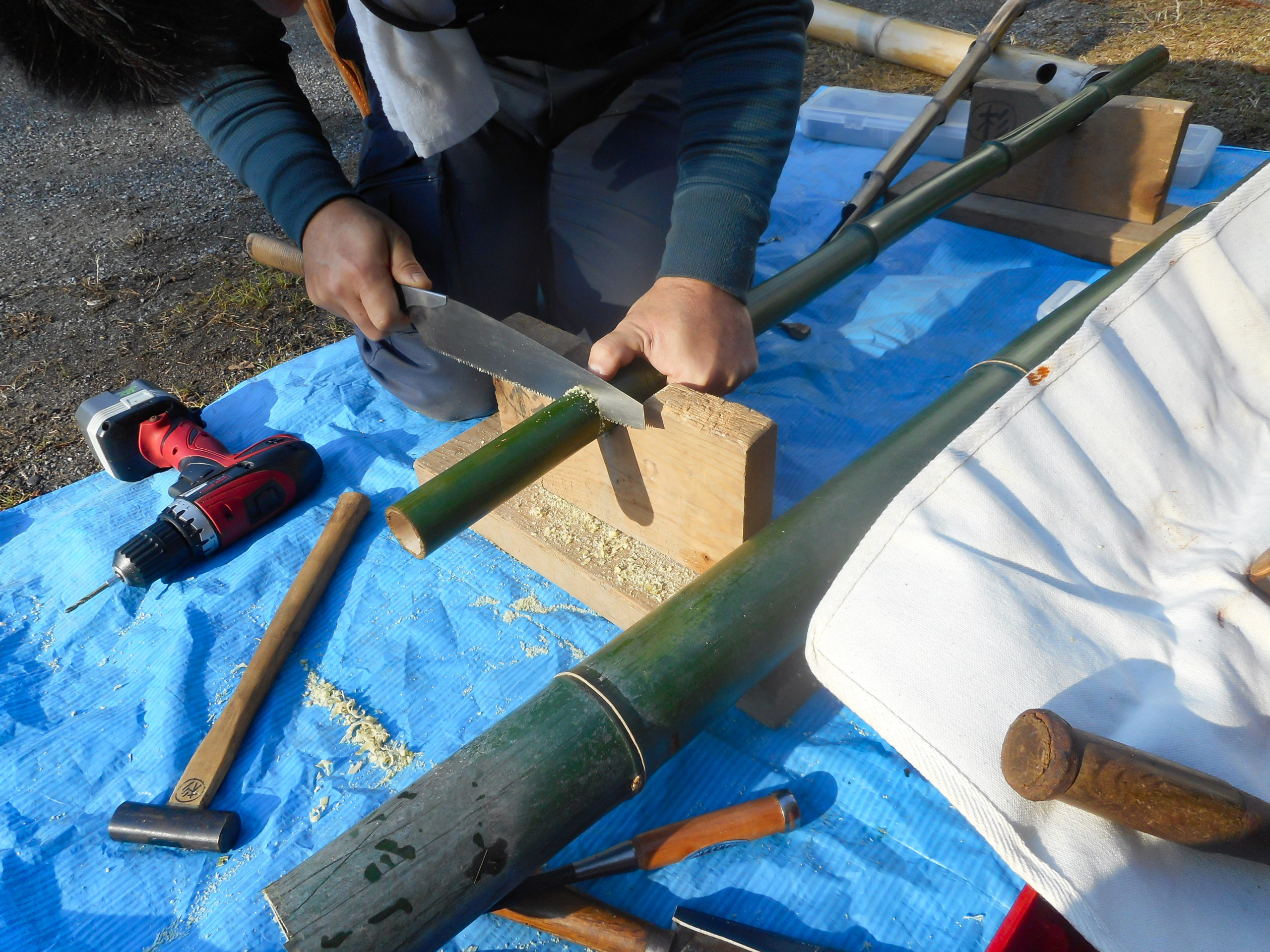 縦樋(たてとい)の太竹と横樋(よことい)の細竹を合わせて、バランスを見ます。