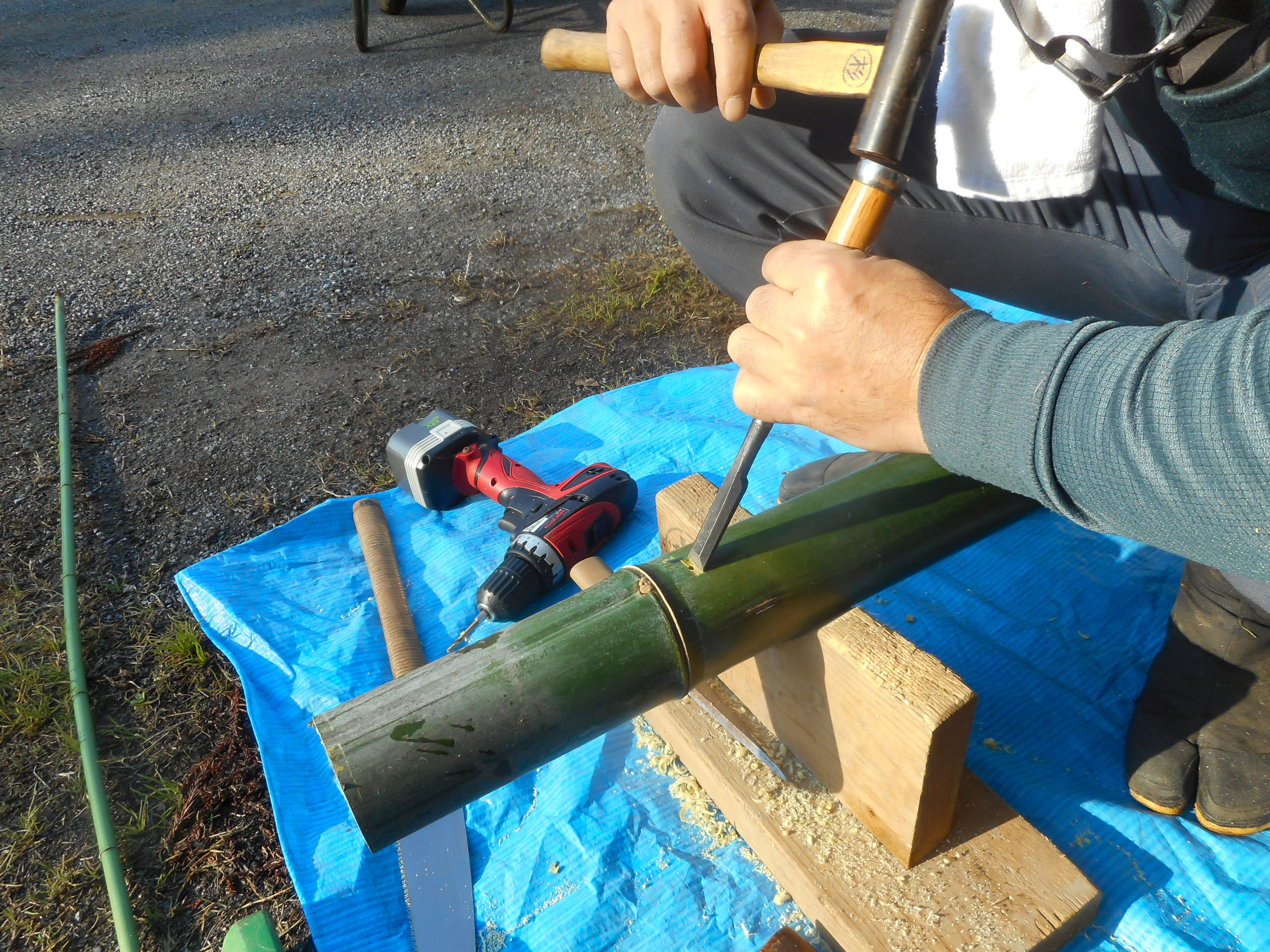 縦樋に横樋を当て赤鉛筆で印をした後、太竹にホルソーまたはドリルで穴を開けます。穴はノミや切り出しナイフだけでも開けることができます。