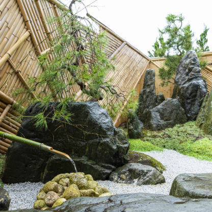 瀛州島は水琴窟(すいきんくつ)と筧(かけひ)を中心とし、茶庭の要素である蹲居(つくばい)形式となります。