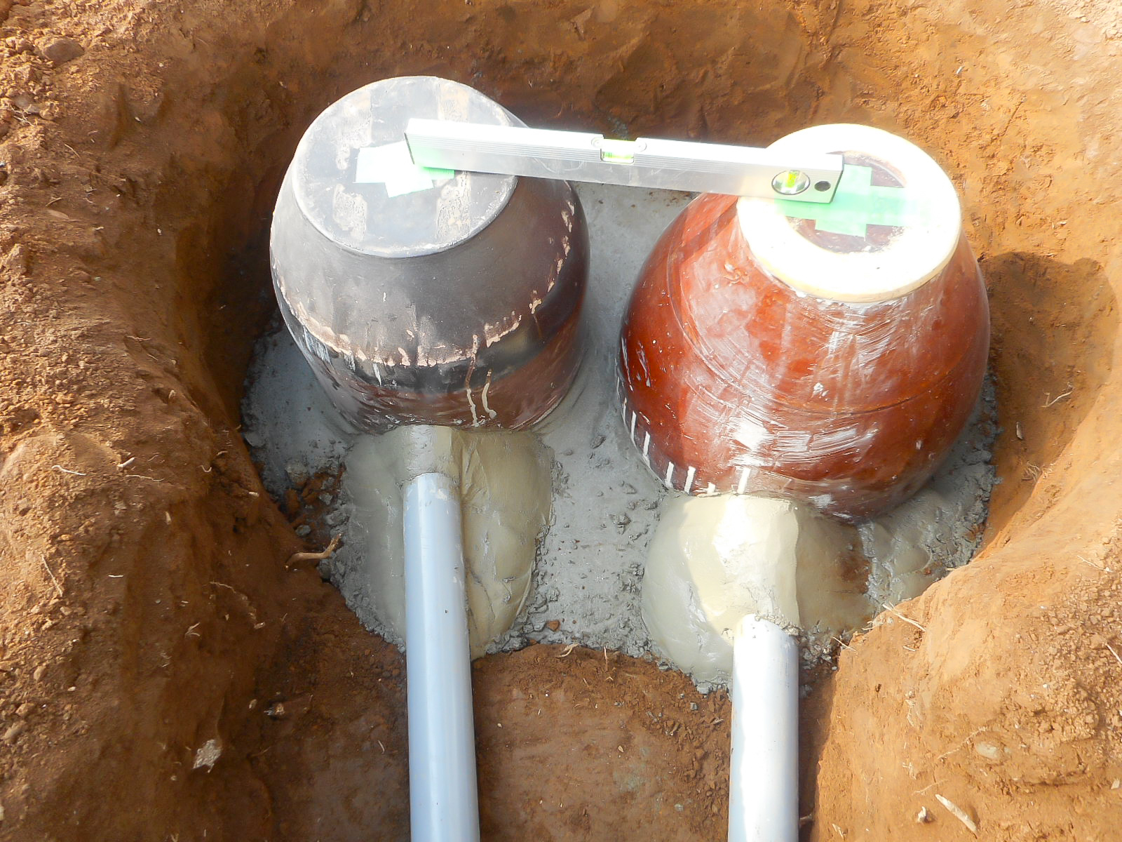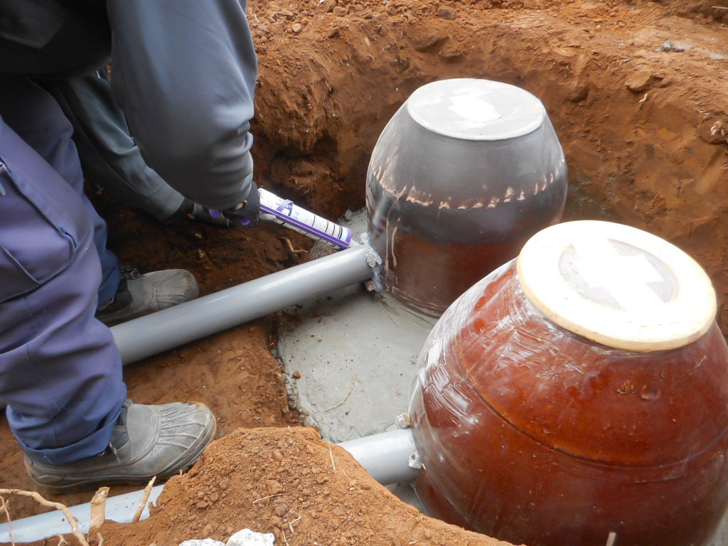 カメに塩ビ管を差し込みます。メモリを付けると正確に差し込めます。また、隙間をシリコンで埋めます。