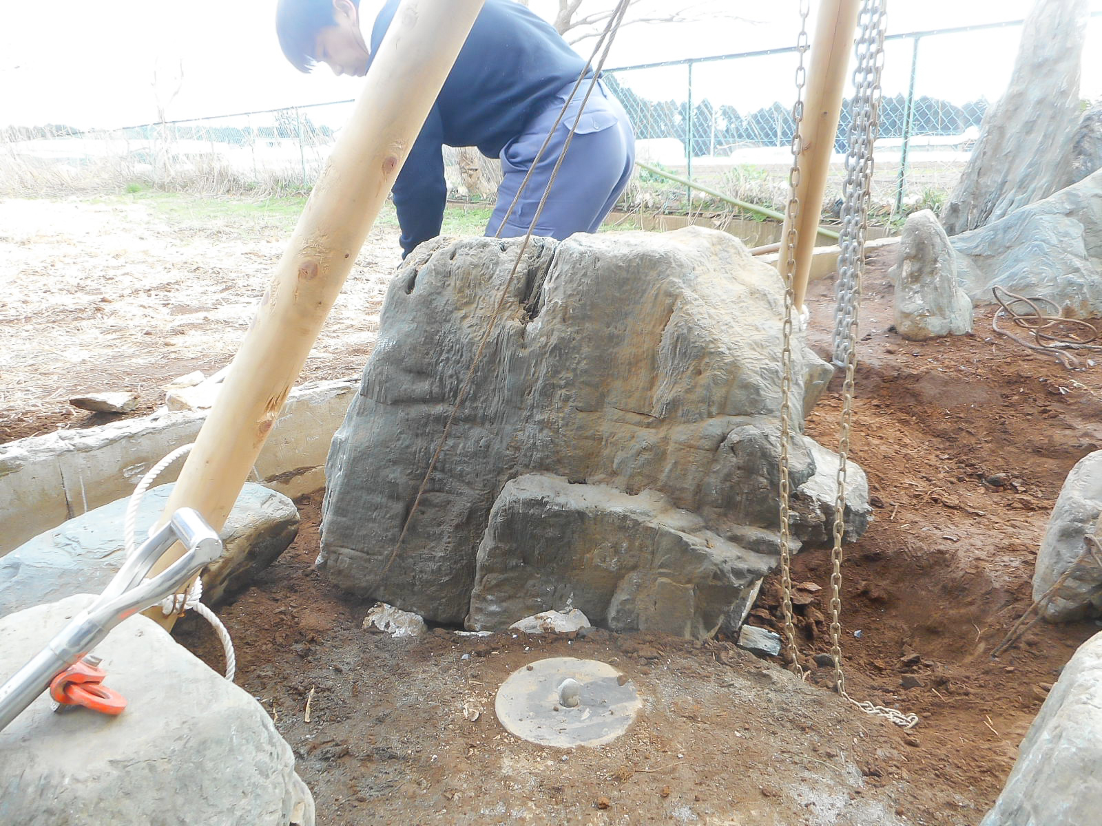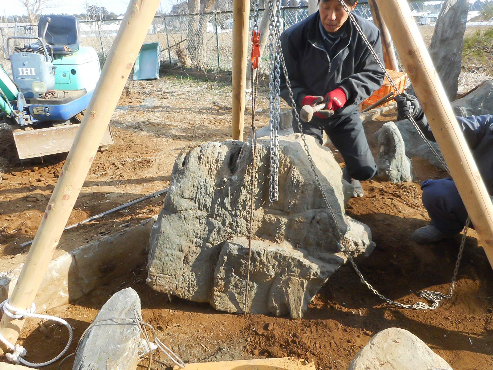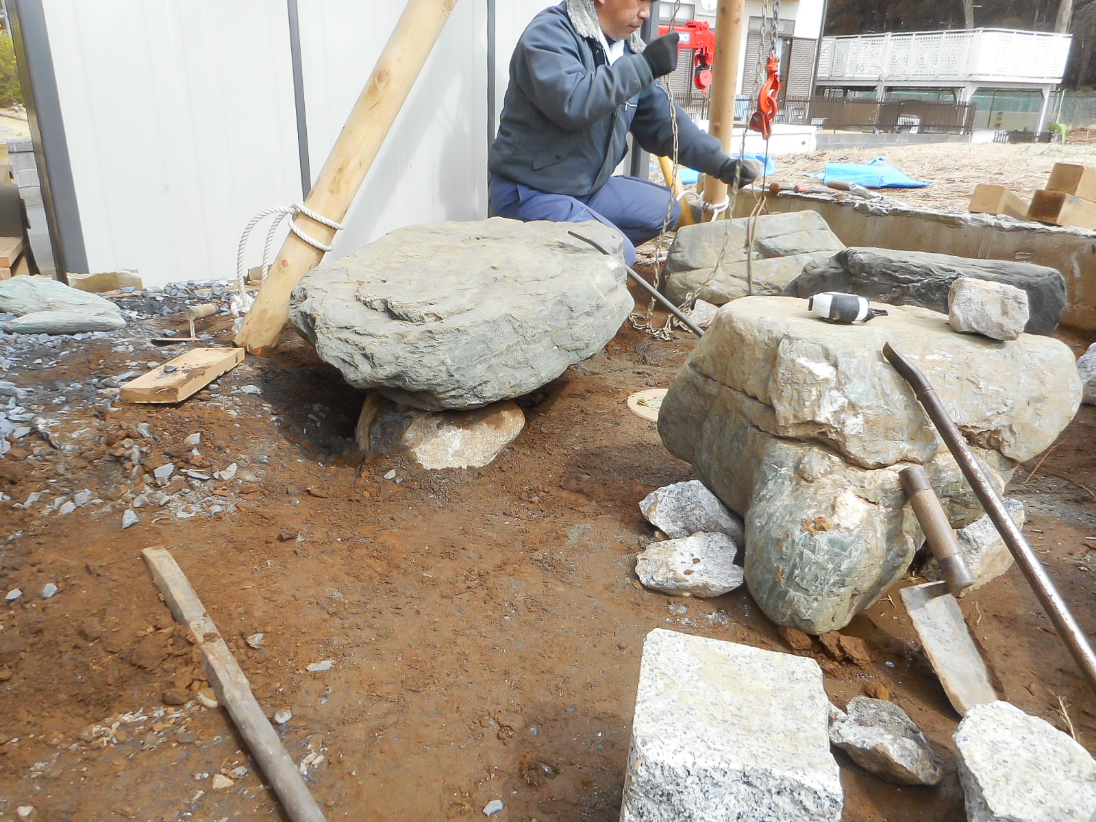 鏡石の角度を調整して、添石(そえいし)を据え付けます。