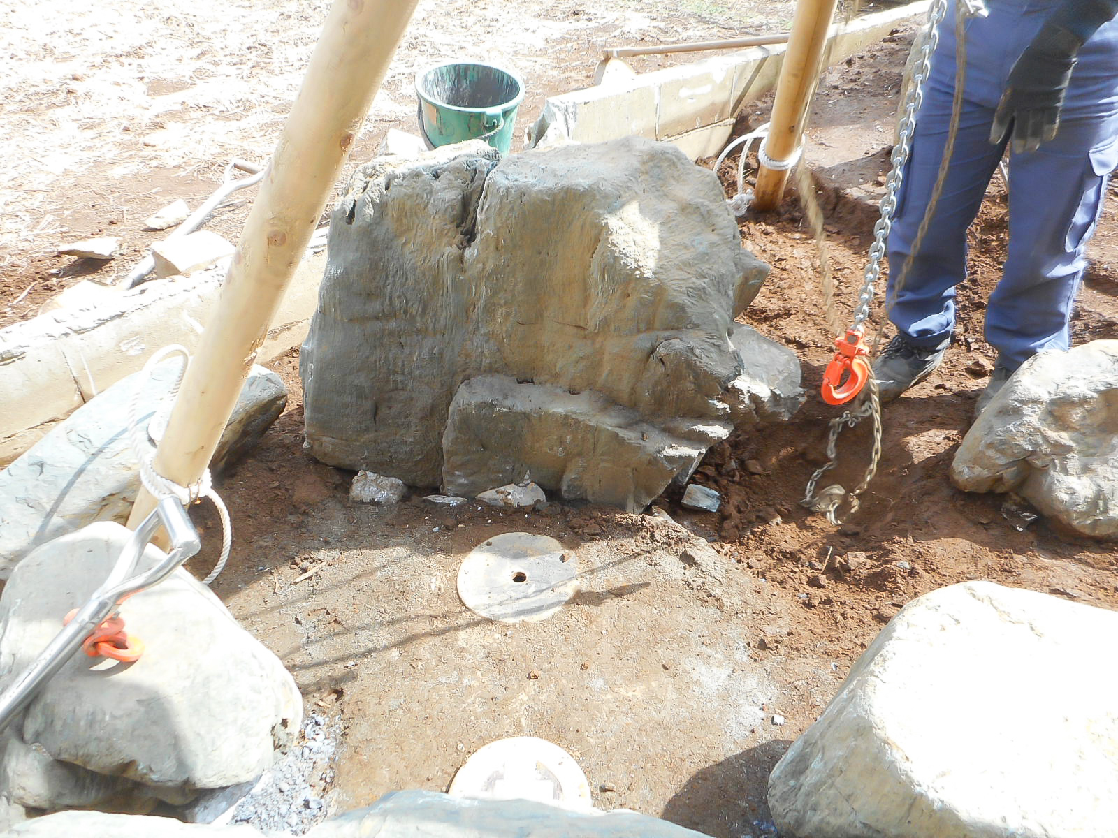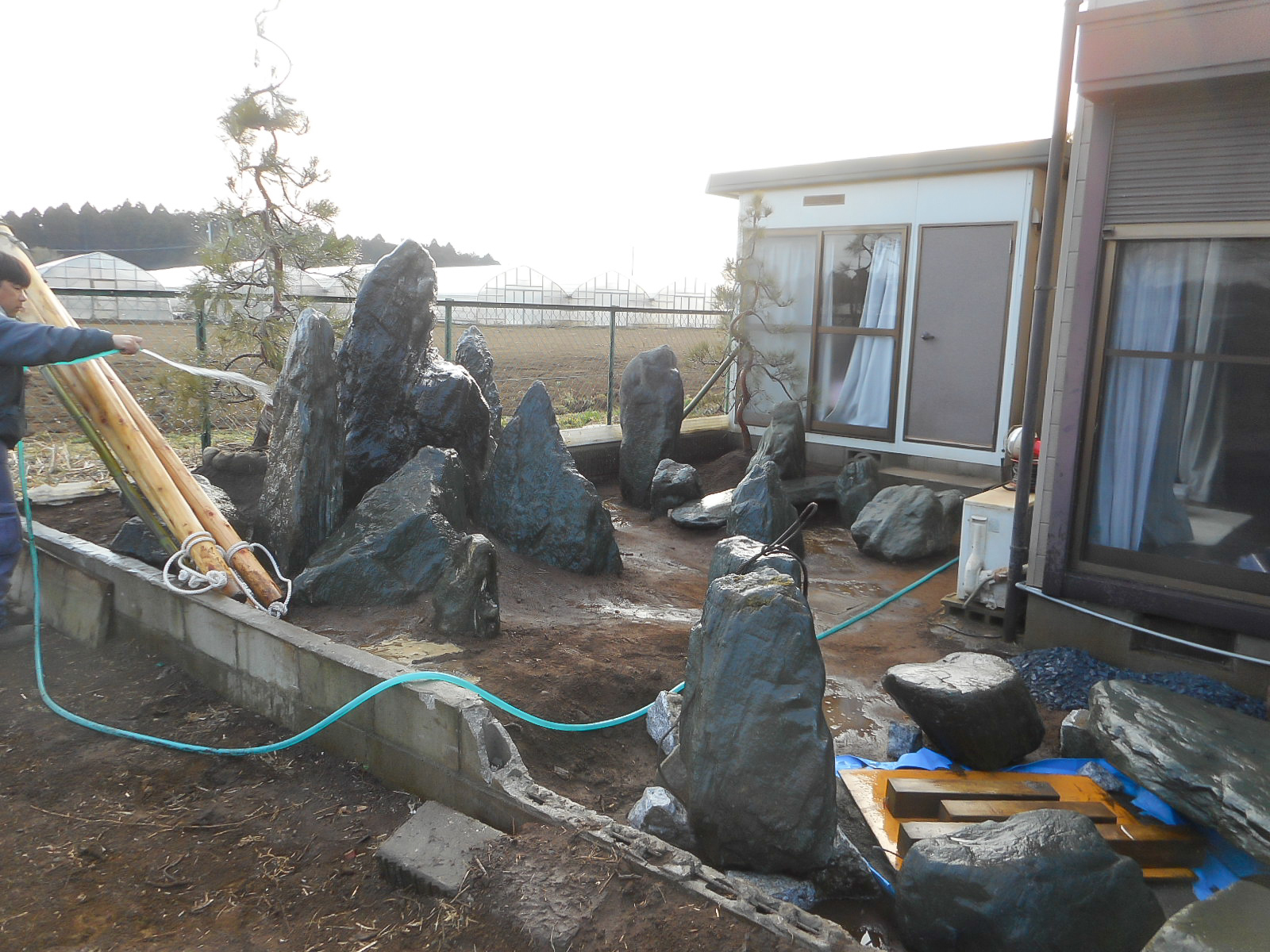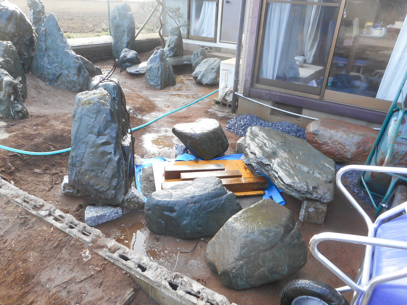 石を水洗いします。石組は、バランスが大事なので仮置きします。