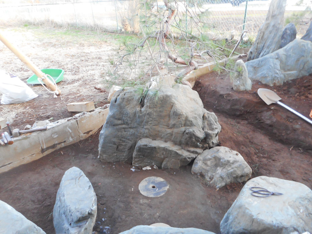 水琴窟に根が入り込まないように裏側に枝垂れアカマツを植えます。植栽は後で根張りを出すため高くします。