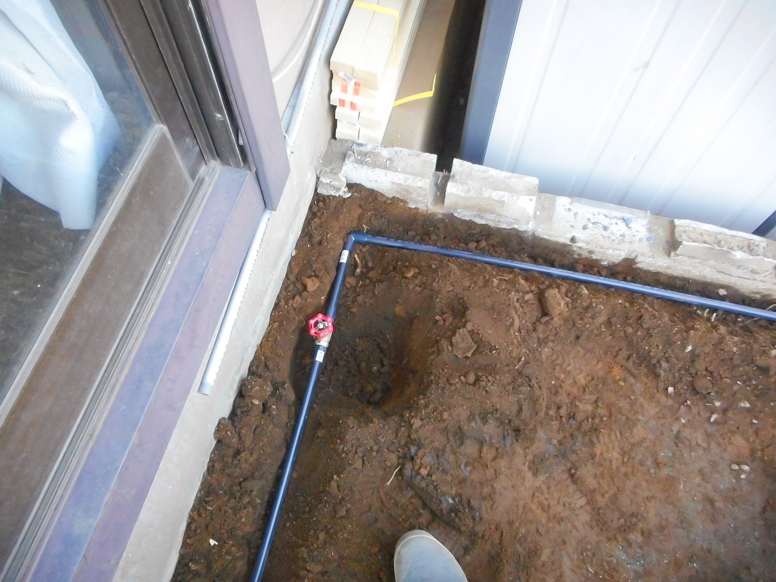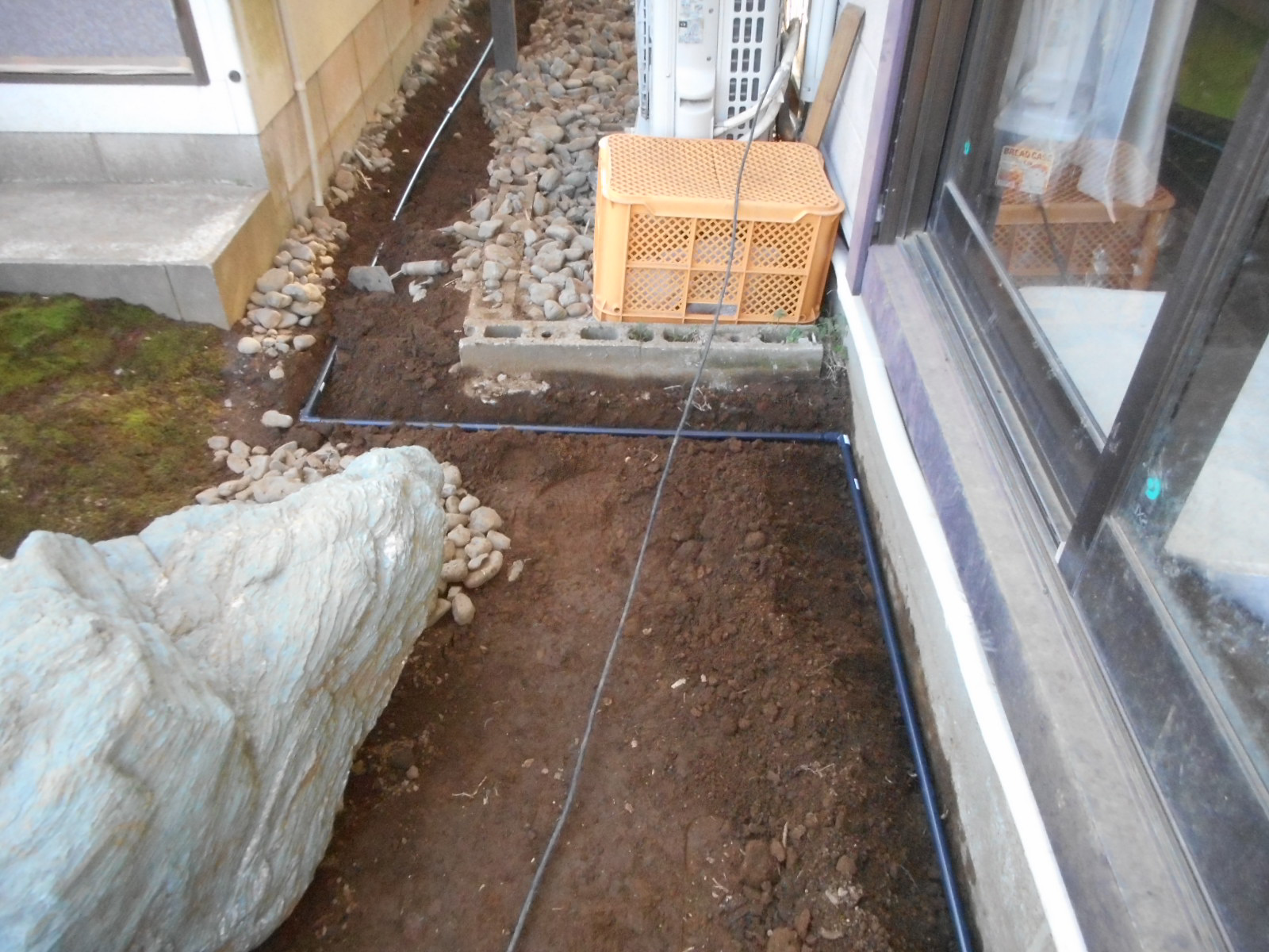 筧用の水道管は建物の際を通します。また、室内から手の届く位置にコックを設置します。