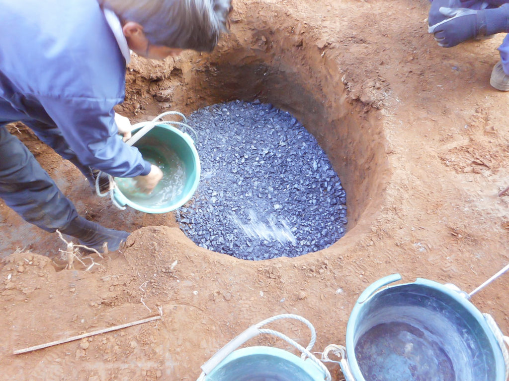 工法の説明に入ります。先ずは水琴窟の作り方から。水琴窟は一昔前には「秘伝の技」などと言われていましたが、蓋をあければ構造は極めてシンプルなものとなっています。しかし、カメの選定や穴を開ける場所や大きさ等、作り手の経験に負う部分が大きく、意図した音を出すとなると難しい排水装置です。
