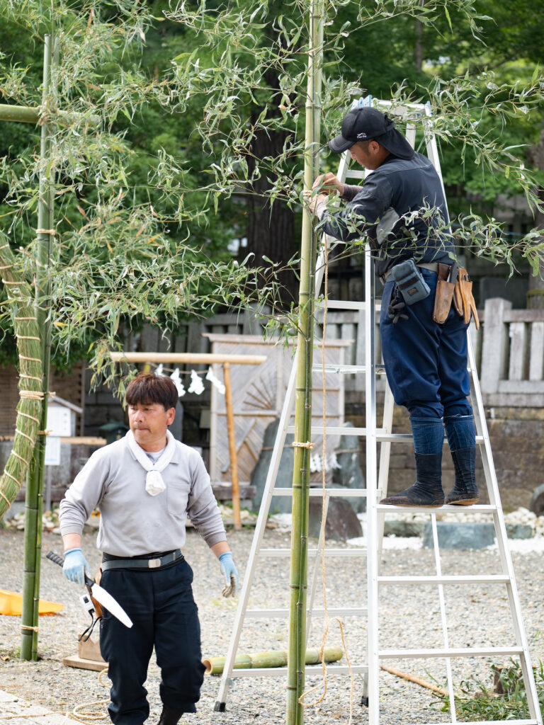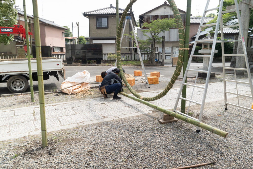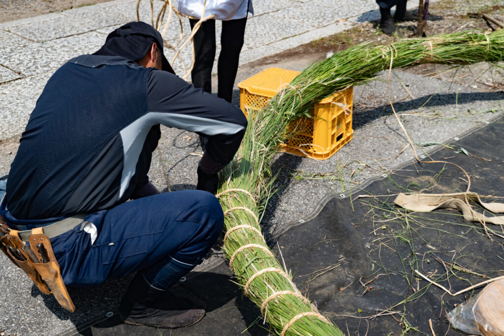 荒縄で茅の輪を取り付けます。茅の輪の結び目を見せないのがコツです。
