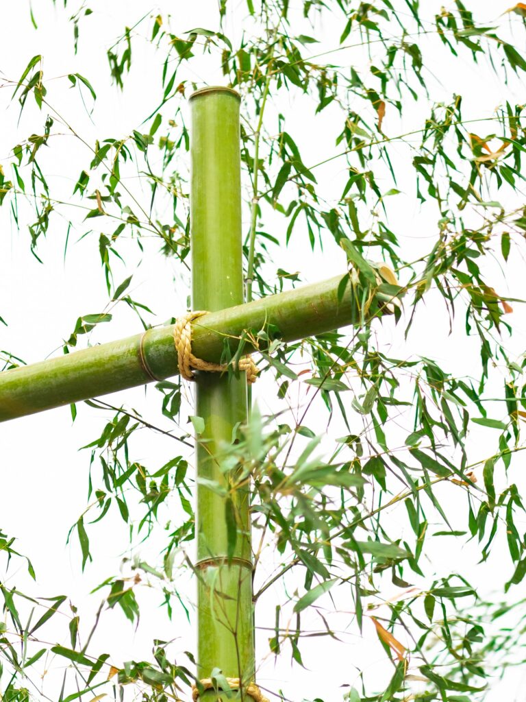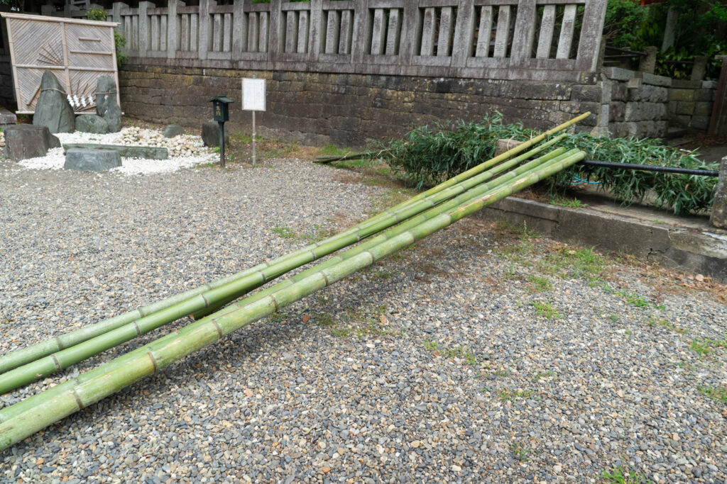 強度を上げるため天端に太竹を添え付けます。横竹は鳥居同様、向かって右が元です。竹はすべて節止めにしましたが、長持ちさせるものではないのでこだわらなくても良いと思います。