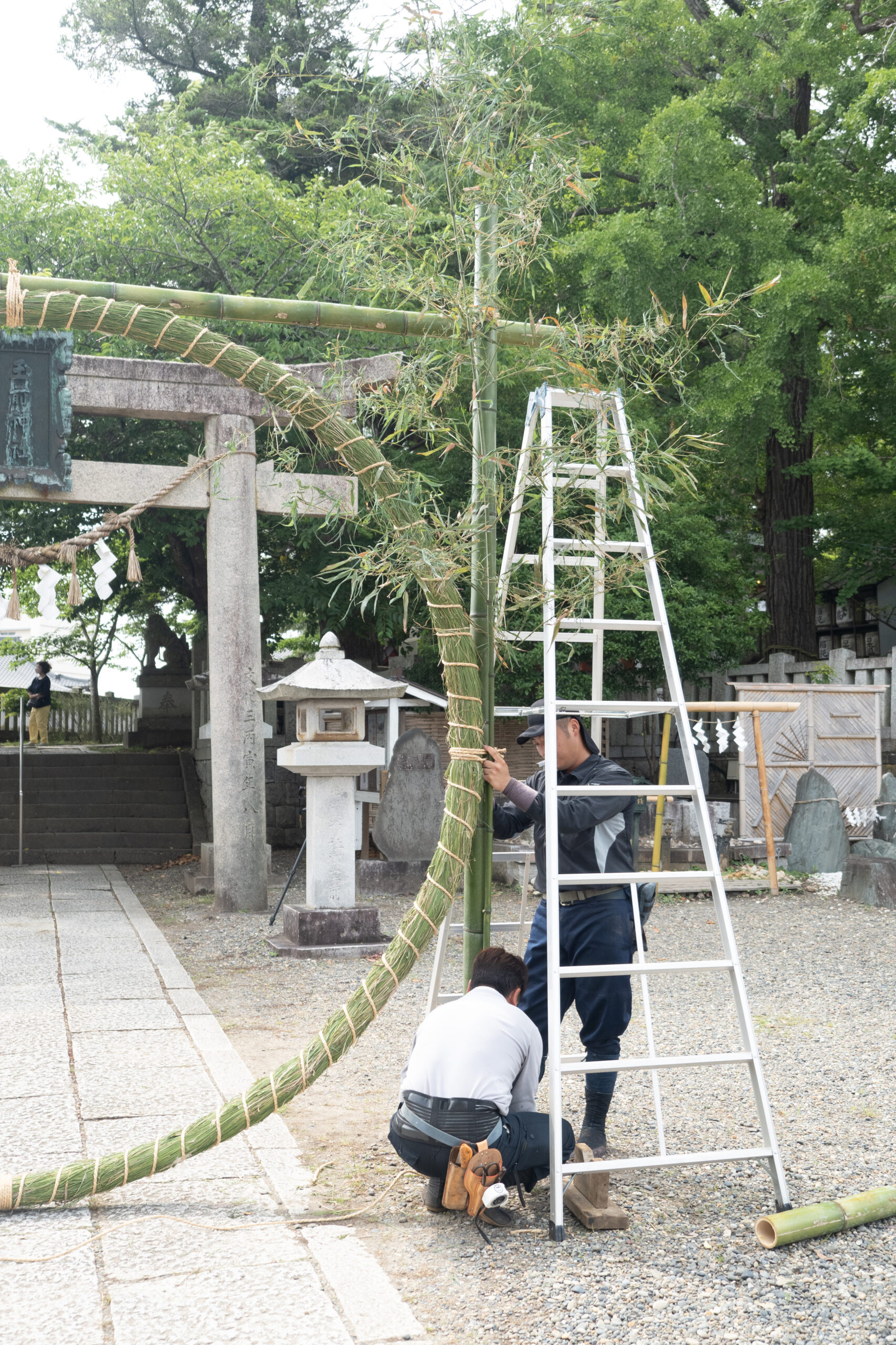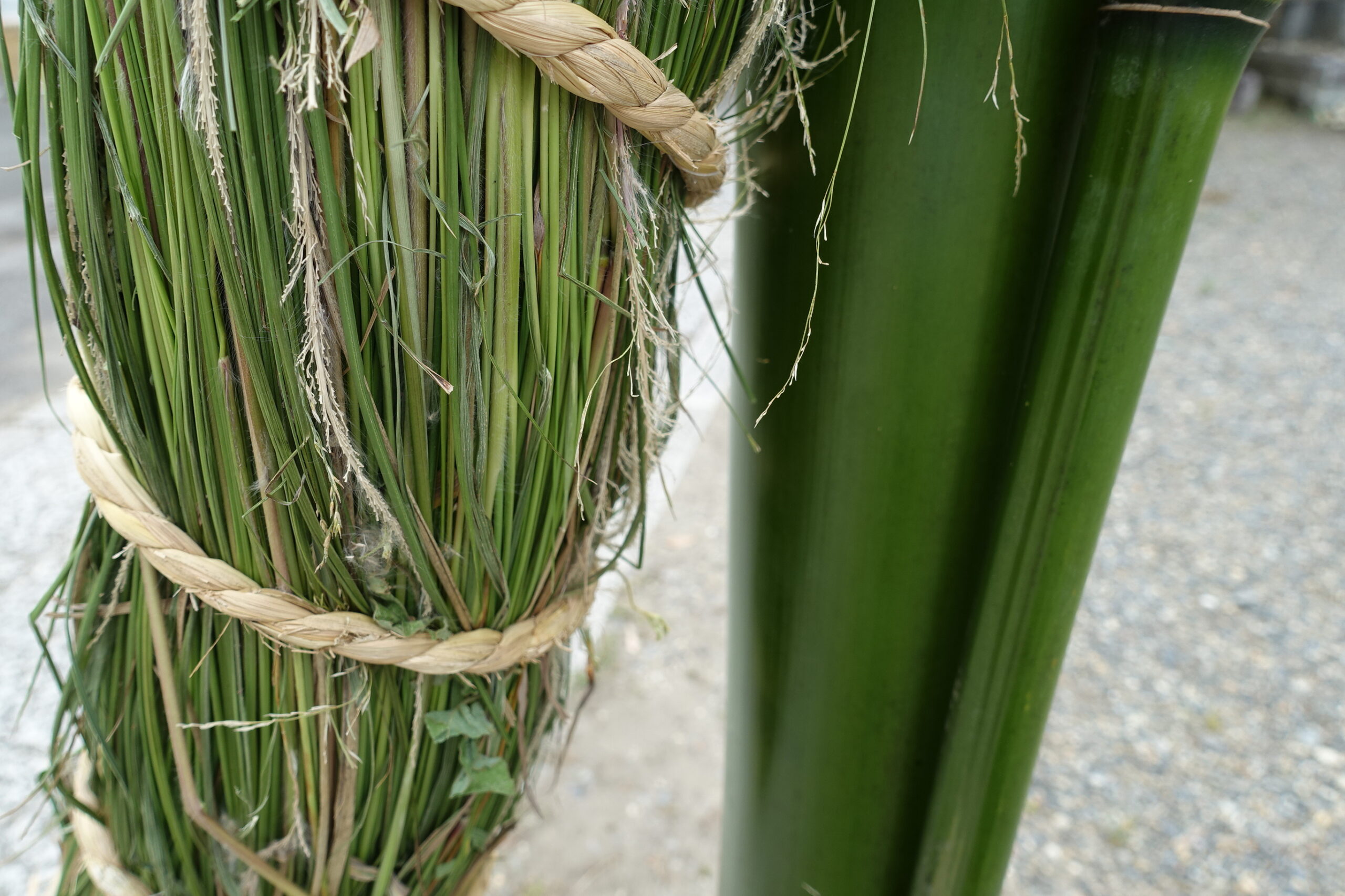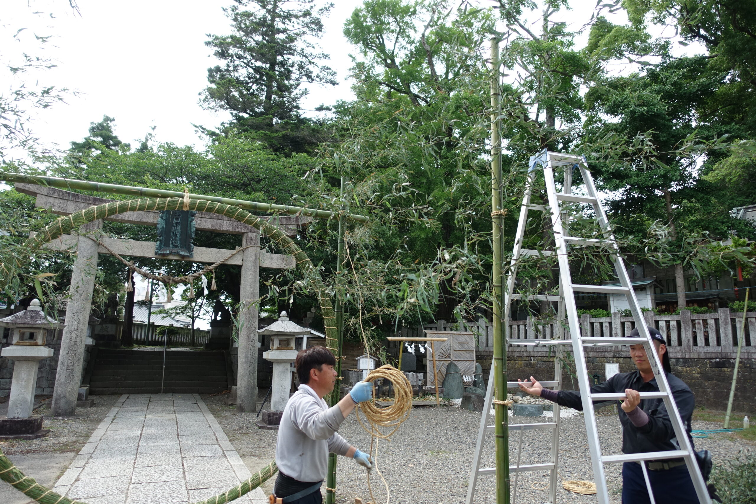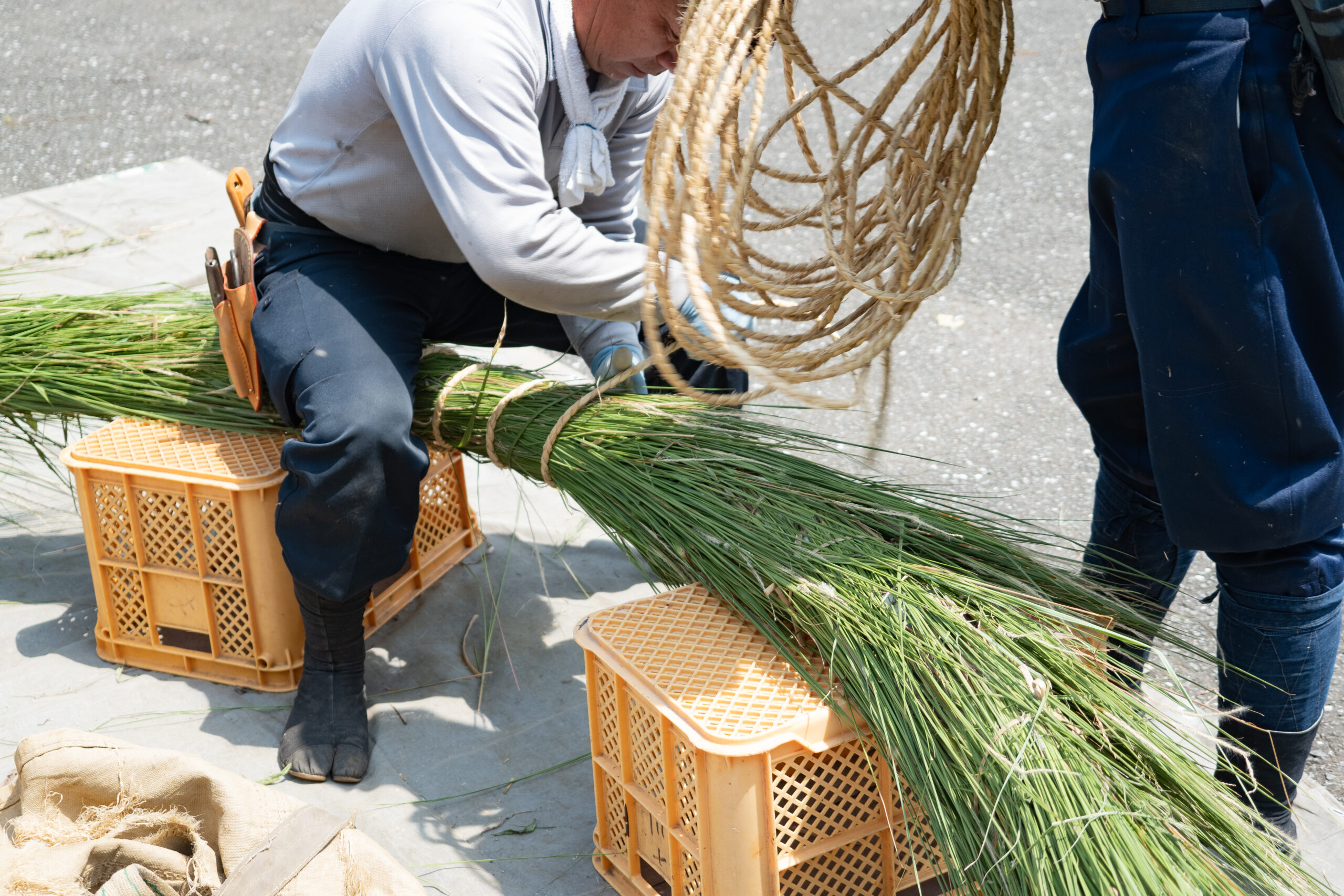 荒縄で茅の輪を取り付けます。茅の輪の結び目を見せないのがコツです。