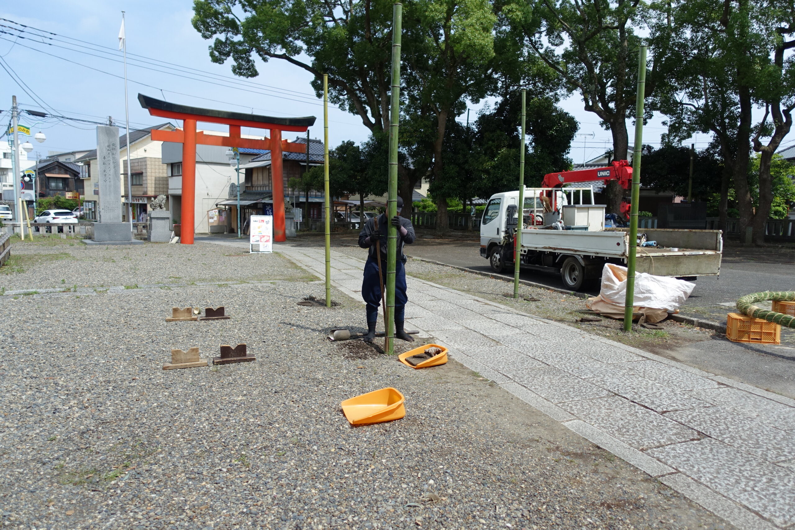 穴を掘り、四方に太竹を立て込みます。正面から見て真っ直ぐ立てるのがコツです。