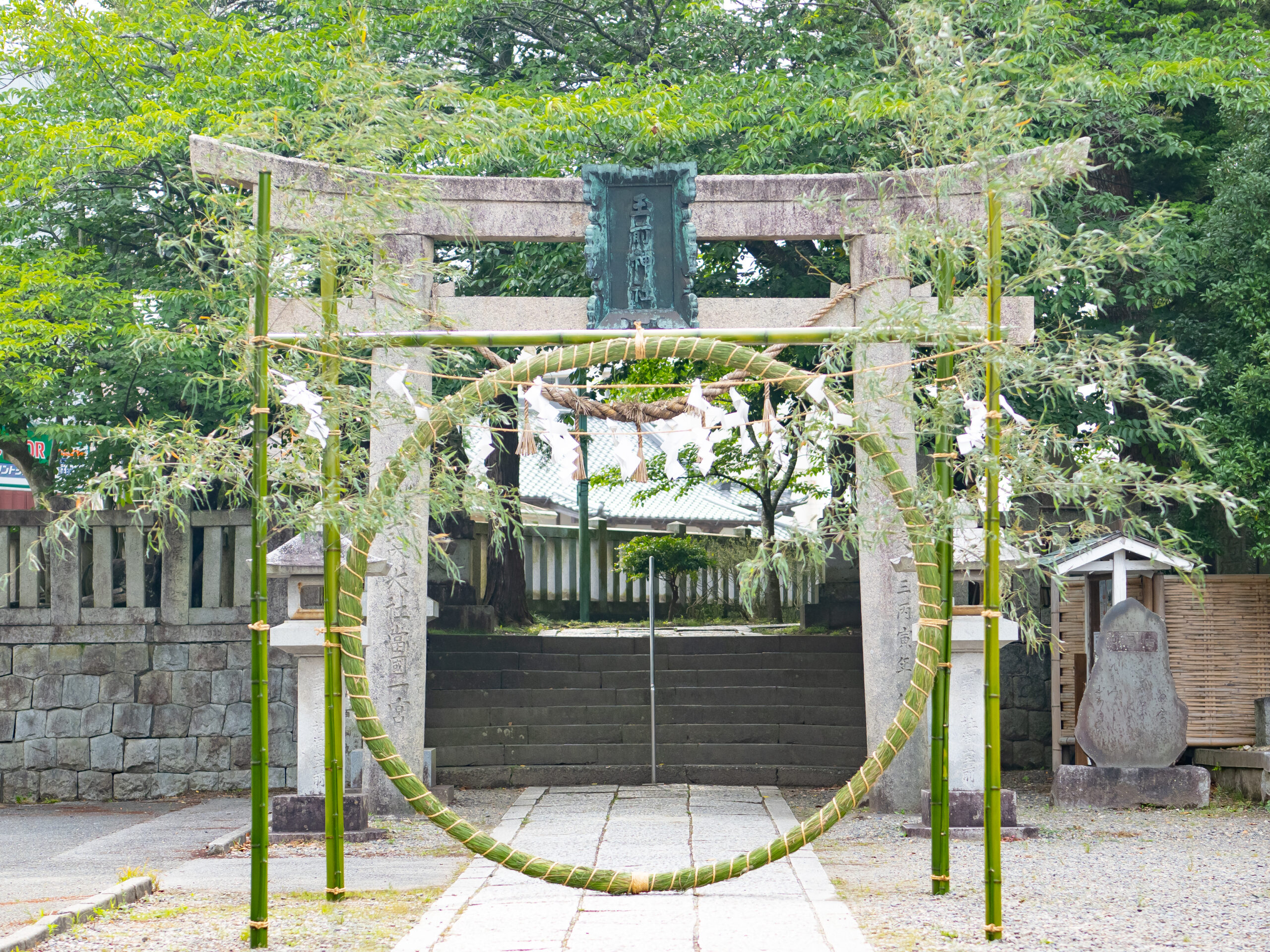 茅の輪とは神社で大祓をする年中行事で、輪の中を三度回ることで清められると言われています。様式はその地方や神社によって異なります。