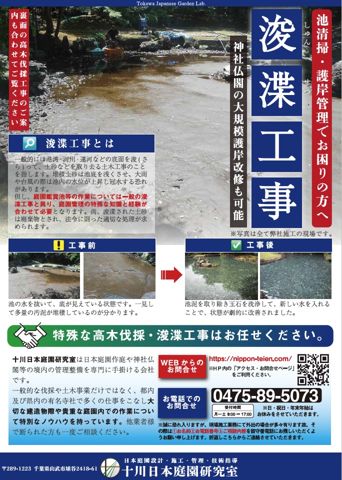 一般的には港湾・河川・運河などの底面を浚(さら)って、土砂などを取り去る土木工事のことを指します。堆積土砂は池底を浅くさせ、大雨や台風の際は池内の水位が上昇し冠水する恐れがあります。日本庭園の鑑賞池等については、一般の浚渫工事と異なり。庭園管理の特殊な知識と経験が必要となります。